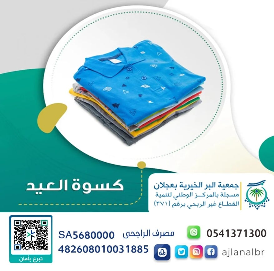 بإذن الله، في جمعية البر الخيرية بعجلان (ترخيص 371)، تكلفة الكسوة الكاملة الجديدة عالية الجودة ، أو ساهم بما تجود به نفسك مهما كان قليلاً – فكل ريال يصنع فرقاً ويرسم ابتسامة.